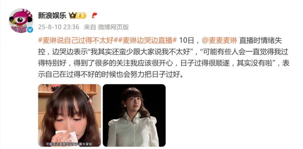 “我其实还蛮少跟大家说我不太好。”麦琳在8月10日的直播中突然情绪崩溃哽咽,眼泪止不住地往下掉。这位因《再见爱人4》爆红又饱受争议的女嘉宾,首次公开承认自己“录完节目后过得不好”,撕开了外界对她“顺风顺水”的想象。