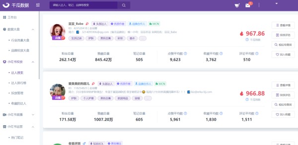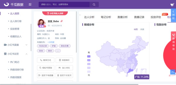 我们可以通过达人搜索功能,筛选出我们护肤类产品的列表,通过达人右侧的查看详情,了解每个达人各方面的小红书数据,了解每一个达人的推广效果、粉丝属性、笔记分析、直播分析、直播记录、投放评估、粉丝地域分布等等,来决定是否选择合作。