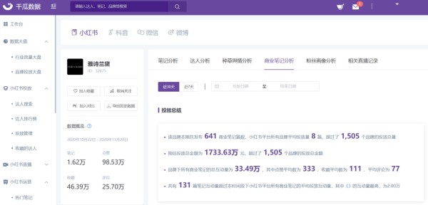 而在操作-详情里面,首先出现的是一个就是整体数据,可以清晰的看到雅思兰黛品牌近30天总共投放了641篇笔记,相比小红书所有品牌平均的8篇投放量,投放力度非常大,超过了1505个品牌的投放总量。