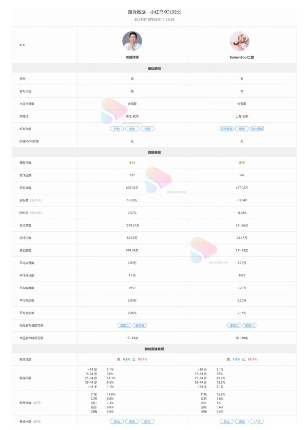 一次可进行4名KOL对比,在对比之后,会给到账号的基础信息、运营数据、粉丝分析、品牌合作人表现(商业合作表现),从而比对数据或是风格相近的KOL表现情况