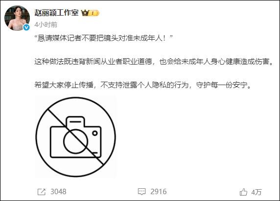 11月18日下午,@赵丽颖工作室 发文:“恳请媒体记者不要把镜头对准未成年人!”这种做法既违背新闻从业者职业道德,也会给未成年人身心健康造成伤害。希望大家停止传播,不支持泄露个人隐私的行为,守护每一份安宁。