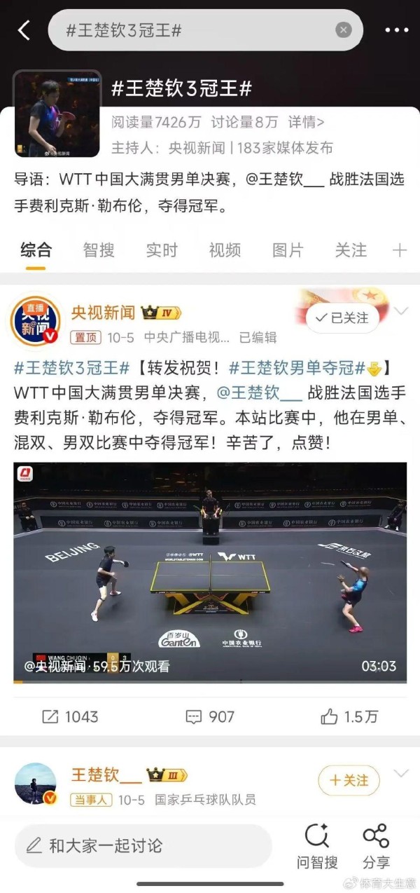 在乒乓球领域,微博也是球迷聊球的第一平台,国乒的每一场比赛都吸引了各方关注。@央视新闻@人民日报 等党央媒体在第一时间追踪报道国乒战绩。今年10月5日,当王楚钦拿下WTT中国大满贯冠军之后,@央视新闻 主持的话题#王楚钦3冠王#登上热搜榜首,长达12小时在榜,足见其受关注程度之高。