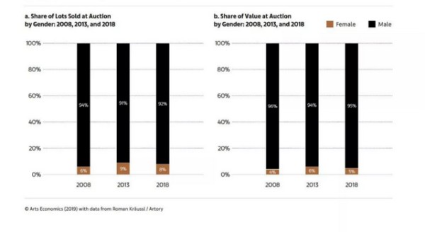 尽管如此,男性艺术家在艺坛仍占主导地位。荷兰马斯特里赫特大学的一项研究表明,在全球拍卖市场中,女性艺术家的作品仅占顶端市场的0.03%,在拍卖市场拍出的所有艺术品之中,男性艺术家的作品占据96%。
