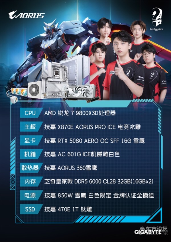 AQ 战队(无畏契约职业战队):获赠全队定制主机,核心配置涵盖 AMD 锐龙 7 9800X3D处理器、X870E电竞冰雕主板及 RTX 5080雪鹰显卡,针对团队竞技场景优化硬件协同性,确保战队成员在训练与比赛中获得一致的高性能体验,全“嘉”桶BUFF加持,助力超神发挥!