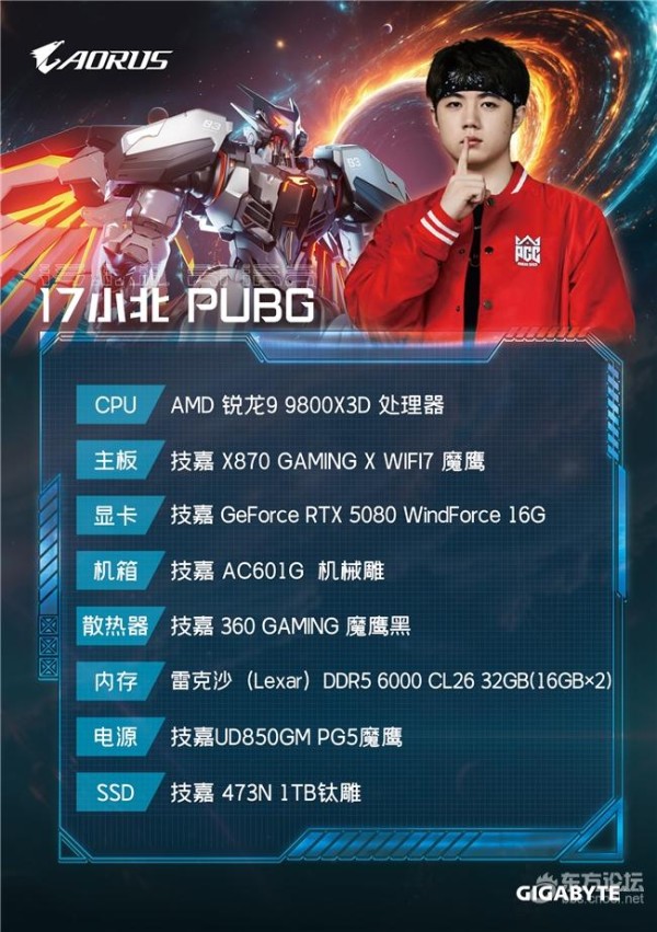 核心配置涵盖 AMD 锐龙 7 9800X3D处理器、技嘉X870魔鹰主板及 RTX 5080风魔显卡,以顶尖硬件配置匹配他 “激进突击手” 的打法风格与关键时刻的爆发需求,技嘉全 “嘉” 桶助力其在职业赛事中释放更强战力。