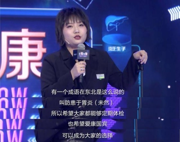 “我从小就胖,体检需要量体重,那个体重称总用超级大的声音报数,赶上学校组织的,在大厅里体检还有回声。整个教学楼都环绕着代表我体重的数字。结尾时,李雪琴用东北话呼吁大家“防患于胃炎(未然),不仅胃炎、肠炎、肝炎。希望大家定期体检,为自己健康负责。”