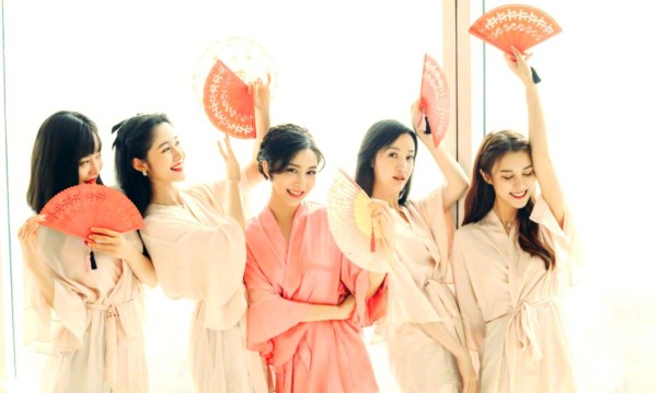 在婚礼上,李子峰身着一套浅粉色西装,与四位好友搭肩合影,显得分外潇洒。而新娘林籽,则身着睡袍,与伴娘团一同持扇合影,众人颜值均十分出众,真可谓是美女与美女的聚会。