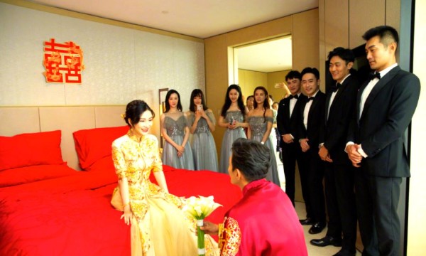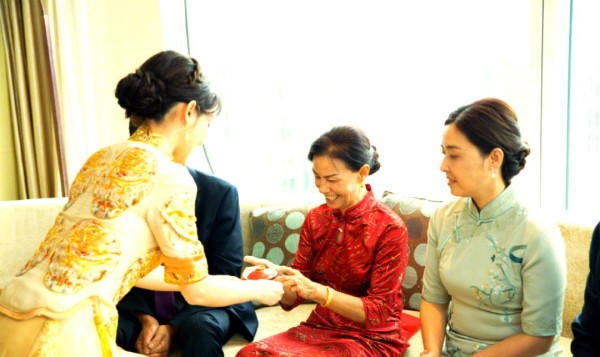 两位新人向四位长辈敬茶,这一环节充满了新意。
