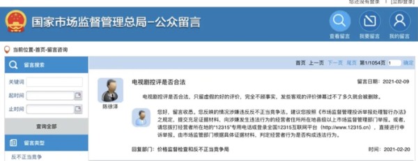 近日,有网友专门向国家市场监督管理总局咨询,“电视剧控评是否合法?”