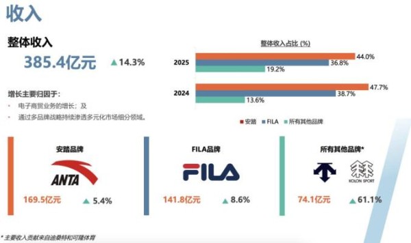 根据安踏发布的2025年半年财报,一直以来作为重要增长引擎的FILA品牌上半年收入达141.8亿元,同比增长8.6%。虽然和主品牌一起合计贡献了集团约80%的收入,但增速均已降至个位数。反观包括迪桑特、可隆在内的其他品牌,收入74.1亿元,同比增长高达61.1%。
