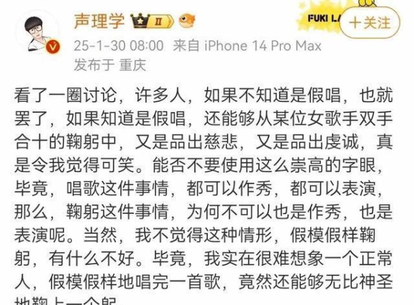 最近,有个在音乐圈里很有名的乐评人公开对王菲的演出表示怀疑,说她在一次重要演出里可能是假唱。这位乐评人音乐知识丰富,耳朵也很灵,他仔细听了王菲的现场演唱,觉得她的声音和录音室里的几乎一模一样,没有现场唱歌时该有的那种自然变化和临场发挥。另外,他还说王菲演出后鞠躬那一下,感觉就像是在演戏,不够真诚,也没显示出对观众的敬意。