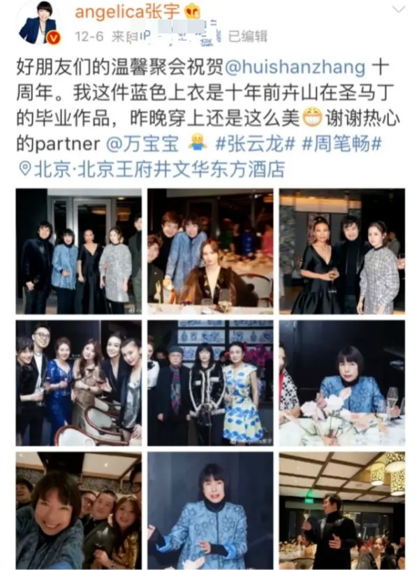 时尚主编张宇在万宝宝的前一天,也就是12月6日晚,也在个人社交平台发了当天参加聚会的照片,张宇在文中也提到“我这件蓝色上衣是十年前卉山马丁的毕业作品”那穿蓝色衣服,一头短发就是张宇了。可以看到的是只要是本人发的照片,几乎都是自己身站C位。不过其他名人合照也是有的,不管是万宝宝,还是张宇的合照中,都看不到章泽天的身影。