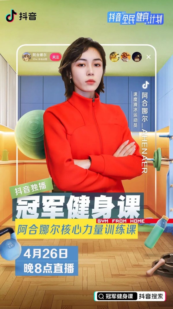 基于日益剧增的健身氛围,今天,抖音正式发起“全民健身计划”,从4月25日-4月30日,抖音将联合世界冠军、演艺明星、优质健身博主等为广大群众呈现一系列精彩健身直播课程,让大家收获干货满满的优质体育健身教学内容。