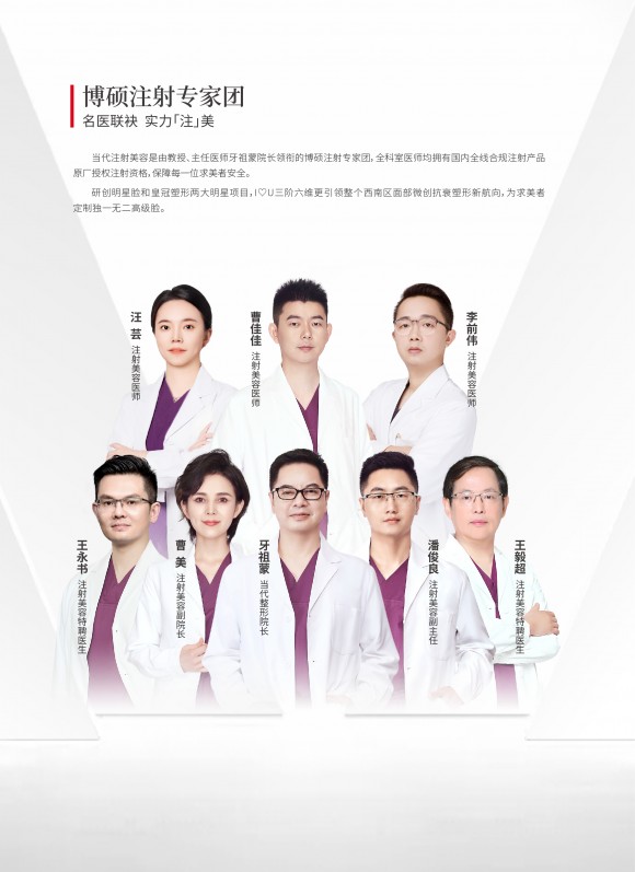 重庆当代整形外科医院注射美容中心由从事整形美容30余年的牙祖蒙院长领衔,以高标准严选团队,成立注射美容学组,配置2位院长+1位主任+2位特聘专家+3位经验丰富医师,不仅拥有丰富的医学理论知识基础,且在再生抗衰塑形、玻尿酸注射等微创项目上具有高度专业的技术水平。同时,学组成员专业创造力强,精于结合顾客自身特点,针对不同的求美者,复配比例、注射部位、注射层次、剂量注射,固定、支撑、收紧等设计个性化定制方案,打造面部最优美学外观,真正重塑骨相轮廓美学。
