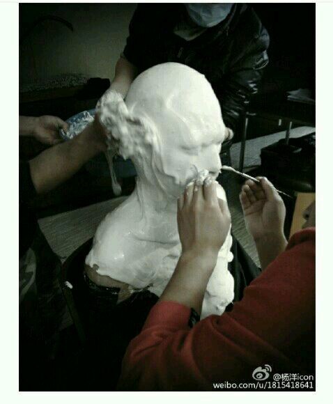 这是杨洋在三生三世里用藻酸盐做倒模的样子。其实这个过程还是有危险性的。因为做脸部倒模是需要流出鼻孔的,要保证鼻孔呼吸流畅。整个人都要被敷盖在厚厚的藻酸盐中,还是很恐怖的。然后在藻酸盐凝固后,需要用石膏绷带做壳,来支撑整个模。有的是外面直接用石膏,石膏在凝固时候会发干发热,如果不慎会有烫伤的危险。