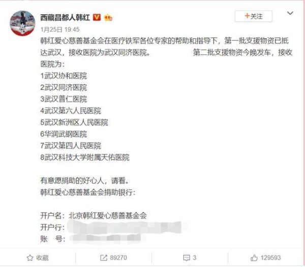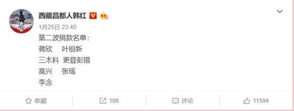 演艺圈在行动!韩红等多好友捐款支援武汉