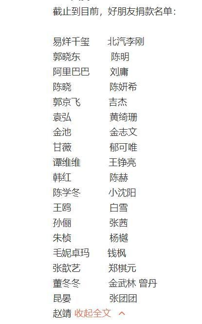 非著名娱评人吴清功指出:1月25日晚上,韩红公布参与捐款的明星好友名单,其中包括易烊千玺、郭晓东、陈晓、陈妍希、郭京飞、袁弘、张歆艺、王鸥、陈赫、小沈阳、孙俪、郁可唯、谭维维、黄绮珊、吉杰等。