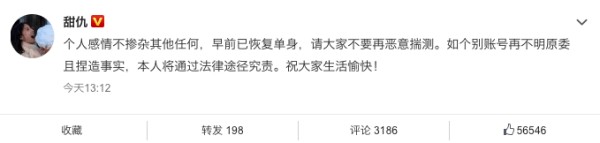 这两个人的真实情况如何,当事人甜仇发文表示:个人感情不掺杂其他任何。