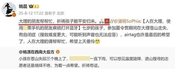 大理苍山的云雾还未散去,王一凯失联的消息却在网络上如同滚雪球般扩散。就在第四天,人们都在焦急等待奇迹时刻,一条来自姚晨的呼吁突然刷屏——“大理的朋友帮帮忙,祈祷孩子能平安归来。”这句简单的话,不仅让无数吃瓜群众揪心,也让娱乐圈里的公益话题再次升温。