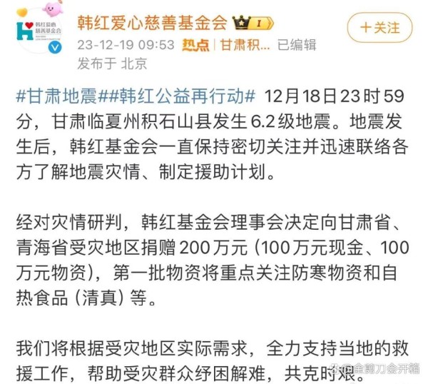 韩红、黄晓明等多位明星艺人为甘肃地震捐赠