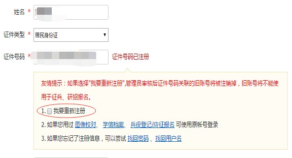 填写身份证号后提示“证件号码已被注册,查看【解决方法】”。