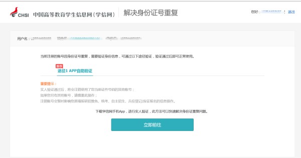 如果您未曾使用此身份证号注册账号的,可以考虑勾选页面“我要重新注册”,正确填写信息后点击【完成注册】;系统会提示您当前注册的账号需要核验身份证信息,使用当前注册的账号登录系统、并选择下途径中的任意一种来完成身份核验事宜