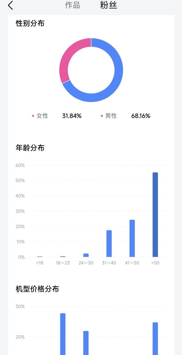综合来看,你的粉丝群体在地域上广泛分布,且在部分省份较为集中;性别上男性占主导;年龄以中老年为主;机型价格偏好呈现两端高、中间相对均衡的特点。