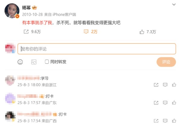 当年,杨幂也曾疑似因公司原因事业受挫,在微博中写下“有本事就杀了我,杀不死,就等着看我变得更强大吧”。