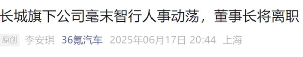 今年6月17日,据36氪汽车报道,长城汽车旗下智能驾驶公司毫末智行正经历高层人事动荡,董事长张凯已提出离职,此外,已有多位中高层管理人员离职,包括技术副总裁艾锐、产品副总裁蔡娜、智行品牌官王佳等关键人物。