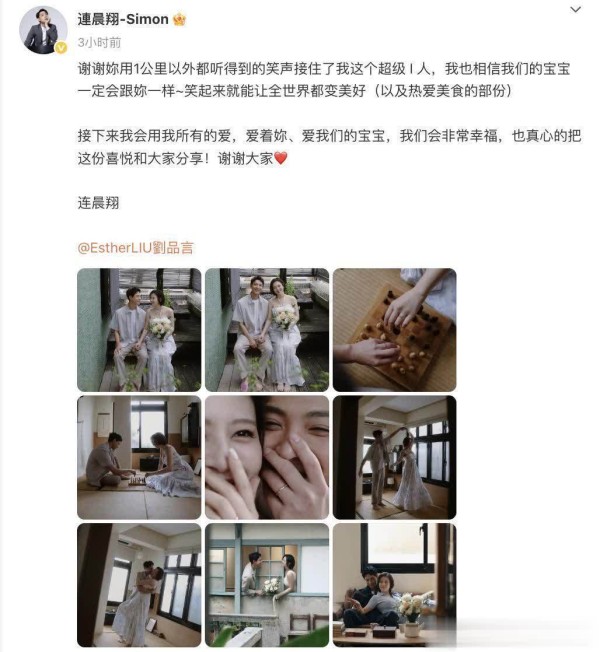 6月9日,中国台湾女演员刘品言公布喜讯,与同为演员的连晨翔喜结连理,并透露已经怀孕。刘品言和连晨翔都在个人社交账号上晒出多张婚纱照,两人非常甜蜜。