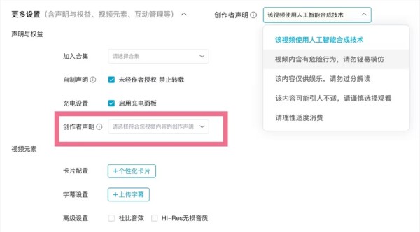 可以在 Web 端进行添加:稿件发布时,在创作中心选择【更多设置】-> 声明与权益-> 创作者声明-> 选择声明类型,目前此功能在测试中,部分用户可使用。