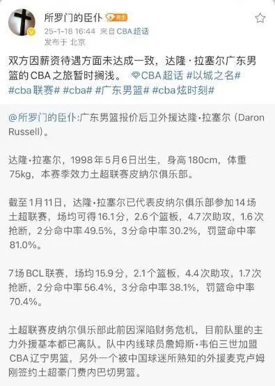 媒体人所罗门的臣仆不久前发文,他写道:“双方因薪资待遇方面未达成一致,达隆-拉塞尔广东男篮的CBA之旅暂时搁浅。”