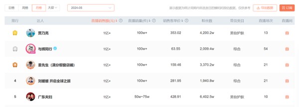 根据蝉妈妈数据,5月,贾乃亮共开播6天,13场次,日均销量为10万-25万件,日均销售额在1亿元以上,成功登顶5月带货达人榜。而由董宇辉领衔的“与辉同行”直播间5月共直播54场,在前10名中直播场次最多,排名位居第二。