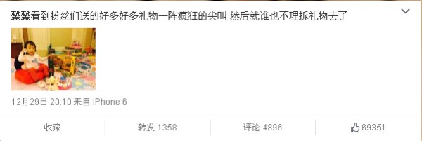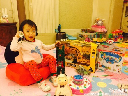 人民网北京12月30日电 (温璐)昨日,贾乃亮晒出一张甜馨的近照,并留言称,“馨馨看到粉丝们送的好多好多礼物一阵疯狂的尖叫,然后就谁也不理拆礼物去了”。照片中,甜馨坐在米奇坐垫上,面对眼前一大堆的礼物,开心的玩耍,其右手拿起一个听筒故作打电话状,表情十分开心。孙俪看到如此多的礼物也不忘微博喊话:“分点给等等和花妹吧!”
