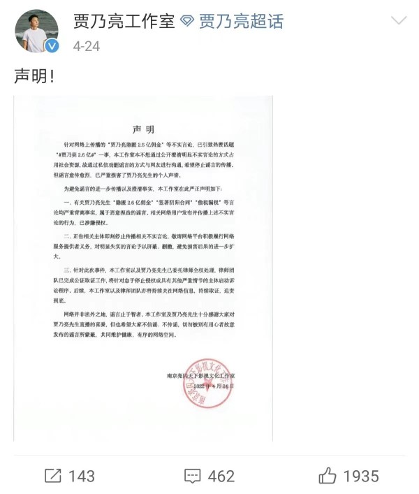 4月24日中午,贾乃亮工作室发表声明对网传“贾乃亮偷税漏税”一事予以否认。