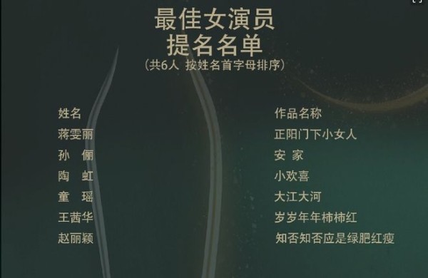最佳女演员还是没有多大争议的,感觉都是凭实力入选的,孙俪 蒋雯丽,陶虹,赵丽颖都是老演员了,演技也是毋庸置疑的,剩下的几个演员也是非常优秀的,都是有实力的演员,想必大家也不会对他们有所质疑了。
