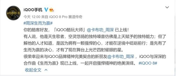 本文属于原创文章,如若转载,请注明来源:iQOO联合歌手周深,合作曲《生而为赢》已上线https://mobile.zol.com.cn/775/7751104.html