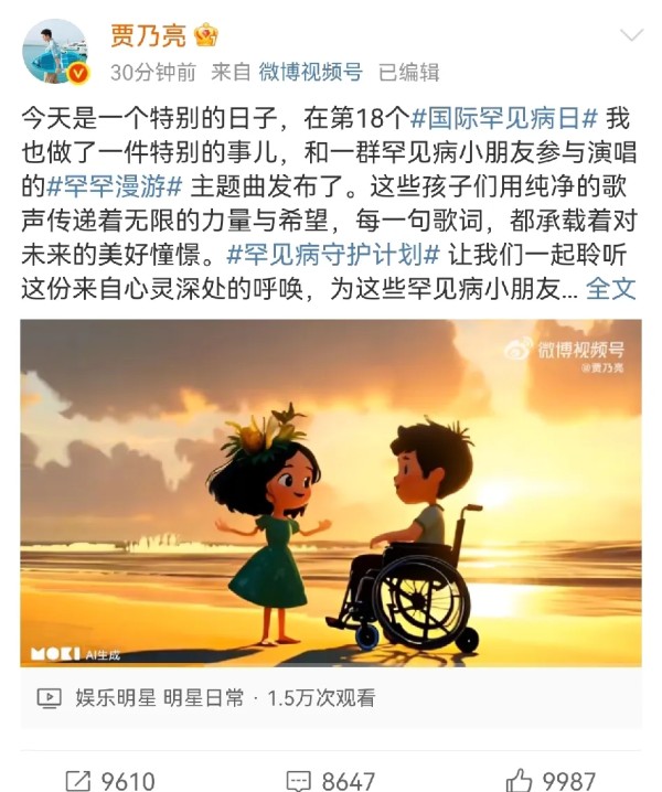 原来今天是国际罕见病日,这次贾乃亮在支持一个公益活动“罕见病守护计划”,他和一群罕见病小朋友一起演唱的主题曲《罕罕漫游》也发布了。