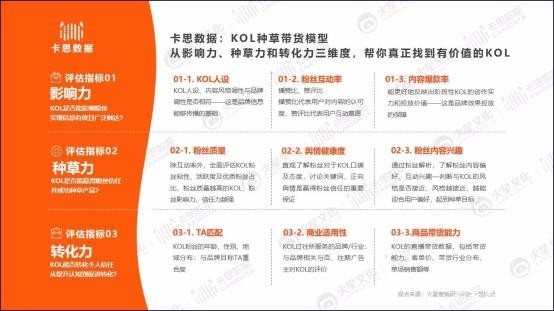 简单表述之:卡思数据可以1)从KOL人设及内容风格调性、粉丝互动率和内容爆款率等3个方面,来评估KOL是否能更好地影响粉丝,实现信息的有效且广泛覆盖,是为:影响力评估标准;2)从KOL粉丝质量、舆情健康度和粉丝内容兴趣等3维度,来综合评估KOL是否能赢得粉丝信任并成功种草产品?是为:种草力评估标准;3)从KOL粉丝与品牌目标用户之间的TA重合度、KOL的商业适用性和商品带货能力等评估KOL能否转化个人信任,从提升认知到促进转化?是为转化力评估标准。