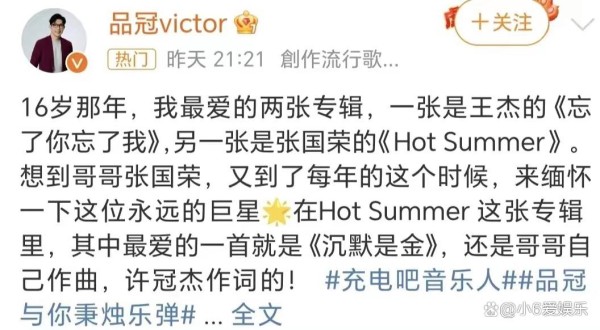 在这个特殊的日子里,歌手品冠也发文缅怀张国荣。他回忆道:“16岁那年,我最爱的两张专辑,一张是王杰的《忘了你忘了我》,另一张就是张国荣的《Hot Summer》。”品冠的话语中透露出对张国荣的深深敬仰和怀念之情。他还特别提到了《Hot Summer》中的《沉默是金》,这首歌不仅旋律优美,更是张国荣自己作曲的经典之作。