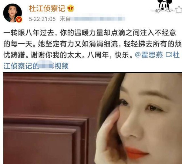 娱乐圈还有一对让人无比羡慕的明星夫妻,那就是杜江霍思燕,两人结婚八年,杜江把霍思燕保护得非常好,从霍思燕的状态可以看出被疼成小公主,5月22日,是两人结婚第八年了,杜江发文再度表白霍思燕,还发布了一段视频,视频中霍思燕拿着香槟甜意满满的看向镜头,尽显爱意。想必两人正在庆祝结婚纪念日,希望两人一直如初,一直相爱下去。