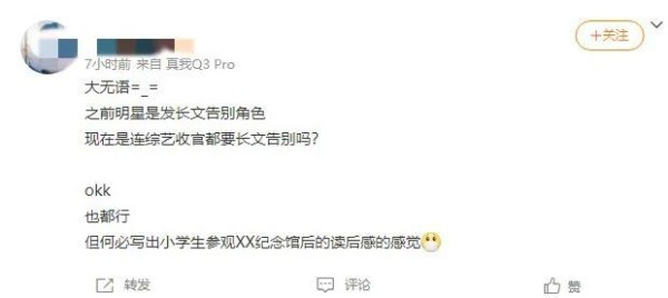 笑果文化的脱口秀编剧梁海源曾就明星“发长文告别”的现象吐槽:“为什么经常有‘某明星发长文’这种热搜标题?因为这些长文,根本就总结不出标题。”也有观众坦言,“大部分明星的‘长文’废话连篇,言之无物,因为缺少对角色的深刻认知和理解,轻慢的创作态度也讲不出背后的细节,内容只能是空泛的抒情和各种感谢。”