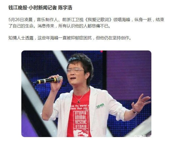 5月又传来一则让人悲痛的消息,据媒体报道称,5月26日凌晨,音乐制作人、前浙江卫视《我爱记歌词》领唱海峰,纵身一跃,结束了自己的生命,据知情人透露,这些年海峰一直被抑郁症困扰。#前我爱记歌词领唱海峰逝世#