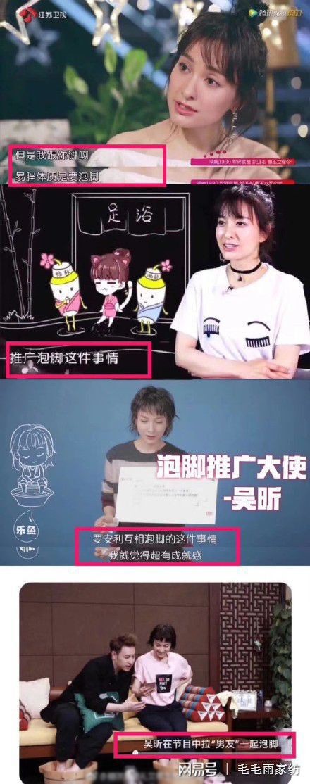 吴昕也是泡脚一族,曾多次在节目中宣传泡脚的好处。甚至上婚恋节目也不放过,第一次见潘玮柏就送上泡脚粉,还拉着对方一起享受泡脚时光,实在让人哭笑不得。