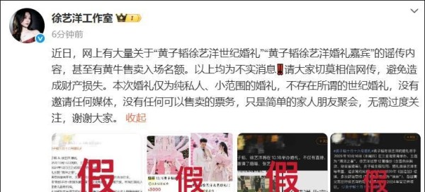 面对风向突变,黄子韬、徐艺洋的工作室14日下午不得不紧急发声。他们的声明打破了所有臆测:目前市面所有流传的婚礼门票、特邀嘉宾等消息都是谣言,根本不存在对外开放的“世纪婚礼”,所有活动仅限家人、密友参加,没有对外票务,媒体也无需到场报道,更别提付费入场这回事儿。声明一出,评论区里一片感慨,有粉丝笑称“明星做个人太难”,也有人劝大家“别给黄牛送钱了”。
