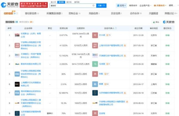 天眼查商业履历信息显示,目前,黄晓明名下关联39家企业,其中10余家为存续状态,包括北京明嘉投资管理有限公司、上海攸合影视文化工作室、北京大咖联盟投资管理合伙企业(有限合伙)、北京良友名都餐饮管理有限公司等,版图涉及投资、传媒、影视、餐饮等。黄晓明在上述公司担任董事长、执行董事、经理等职务。
