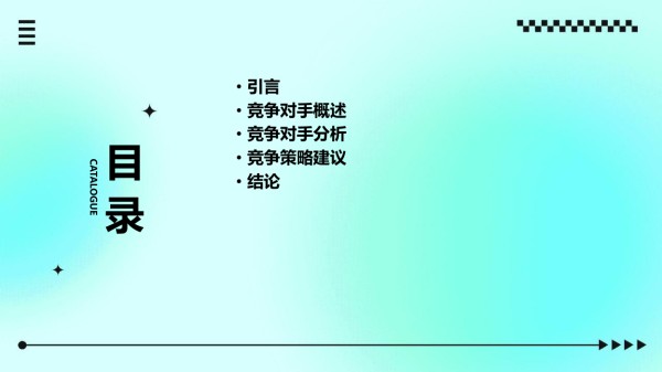 ONE KEEPVIEW2023-2026《竞争对手研究》ppt课件REPORTING•引言•竞争对手概述•竞争对手分析目•竞争策略建议•结论录CATALOGUEPART01引言目的和背景目的了解竞争对手的实力、优势和劣势,为企业的战略决策提供依据背景随着市场竞争的加剧,对竞争对手的研究变得越来越重要研究范围和方法范围选定目标市场,确定主要竞争对手,分析其市场表现、产品、技术、财务等方法收集公开资料、访谈、问卷调查、实地观察等PART02竞争对手概述竞争对手类型01020304直接竞争对手间接竞争对手潜在竞争对手替代品竞争对手与企业在同一市场上提供相同提供与本企业产品相关的其他可能进入市场的新企业或新产提供能够替代本企业产品/服或相似产品/服务的企业产品/服务的企业品务的其他产品/服务的企业竞争对手市场定位中端市场定位提供性价比高的产品/服务,满足低端市场定位大众市场需求以价格优势吸引对价格敏感的消费者高端市场定位针对高端消费者或特定需求的企业,提供高品质、高附加值的产品/服务竞争对手优劣势分析优势分析劣势分析机会分析威胁分析分析竞争对手在市场上指出竞争对手在市场上分析竞争对手在市场上分析竞争对手在市场上的竞争优势,如品牌知的不足之处,如产品质的发展机会,如新技术面临的威胁,如政策风名度、渠道覆盖、技术量、服务水平、管理效的应用、市场增长等险、经济周期波动等实力等率等PART03竞争对手分析竞争对手产品分析产品特点对比产品定价策略详细对比竞争对手产品的特点,研究竞争对手的产品定价策略,包括性能、功能、外观等,以包括价格水平、定价方式、价表格或图表形式呈现格调整等,以判断其市场定位产品优缺点分析产品市场占有率针对竞争对手产品的优点和缺统计竞争对手产品的市场占有点进行深入分析,了解其满足率,了解其在市场中的地位和市场需求的能力影响力竞争对手营销策略分析营销渠道分析品牌建设与推广分析竞争对手的营销渠道,包括线上和线下研究竞争对手的品牌建设与推广策略,包括渠道,了解其销售网络和覆盖范围品牌形象、品牌传播、品牌合作等促销与广告策略客户关系管理分析竞争对手的促销和广告策略,了解其吸研究竞争对手的客户关系管理策略,包括客引顾客的策略和手段户沟通、售后服务、客户满意度等竞争对手组织结构和管理团队分析组织结构分析管理团队背景了解竞争对手的组织结构、部门设置、深入了解竞争对手管理团队的背景、岗位职责等,以判断其运营效率和决经验和专长,以评估其战略制定和执策能力行能力企业文化与价值观人力资源策略分析竞争对手的企业文化和价值观,研究竞争对手的人力资源策略,包括了解其对员工和客户的影响力招聘、培训、激励等,以评估其人才储备和发展潜力竞争对手财务状况分析财务报表分析财务指标对比获取竞争对手的财务报表,对其资产状况、将竞争对手的财务指标与行业平均水平进负债情况、盈利能力等进行深入分析行对比,了解其在行业中的财务状况和竞争力投资与融资活动成本与费用分析关注竞争对手的投资和融资活动,了解其分析竞争对手的成本和费用结构,了解其资金来源和用途,以判断其扩张和发展计成本控制和盈利能力划PART04竞争策略建议产品策略建议产品差异化研究竞争对手的产品特点,寻找差异化的机会,以独特的功能或特点吸引消费者持续创新不断投入研发,推出新产品或优化现有产品,保持市场竞争力营销策略建议市场定位明确目标市场,通过精准的定位吸引潜在客户品牌建设强化品牌形象,提升品牌知名度和美誉度组织结构和管理团队优化建议组织结构调整根据竞争态势调整组织结构,提高决策效率和执行力人才培养与引进加强内部人才培养,同时引进外部优秀人才,提升团队整体素质财务策略建议成本控制优化采购、生产等环节,降低成本,提高盈利能力合理投资审慎评估投资项目,确保资金的有效利用和回报PART05结论研究总结•市场定位通过对比分析,我们发现竞争对手在市场定位上各有千秋有的注重高端市场,有的聚焦中低端用户,还有的选择特定行业或领域进行深耕这表明市场细分的重要性,以及针对不同用户群体提供差异化服务的必要性•产品与服务在产品和服务方面,竞争对手们各具特色有的注重创新和研发,不断推出新产品;有的则在服务和售后上下功夫,努力提升客户满意度这提醒我们,单纯的产品功能和性能已经不再是竞争的唯一要素,如何提供更好的用户体验和附加价值变得至关重要•营销策略在营销策略上,竞争对手们采用了多种手段,包括传统广告、社交媒体推广、合作伙伴关系等这表明营销渠道的多元化和整合营销的重要性我们需要根据自身特点和目标客户群体,选择合适的营销策略,并不断创新和调整•组织与文化通过对竞争对手的组织结构和企业文化进行研究,我们发现不同的组织结构和文化对企业的运营和发展有着重要影响这提醒我们,组织结构的合理性和企业文化的建设同样不可忽视,它们是保障企业持续健康发展的重要基石对公司的启示和展望•市场定位根据竞争对手的市场定位和战略,我们需要重新审视自身的市场定位,并寻找可能的细分市场或用户群体,以提供更加精准和差异化的服务同时,我们也需要关注行业发展趋势和潜在机会,