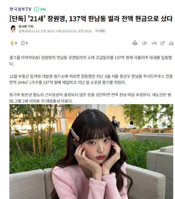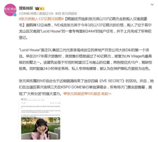 一则房产交易消息,让IVE成员张元英再次成为热议焦点。韩媒11月12日披露,这位顶流女偶像于今年3月签约,以高达137亿韩元(约合人民币7400万元)的价格,拿下了首尔龙山区汉南洞的顶级豪宅“Lucid House”中的一套独户住宅,并于上月正式完成了所有权登记。