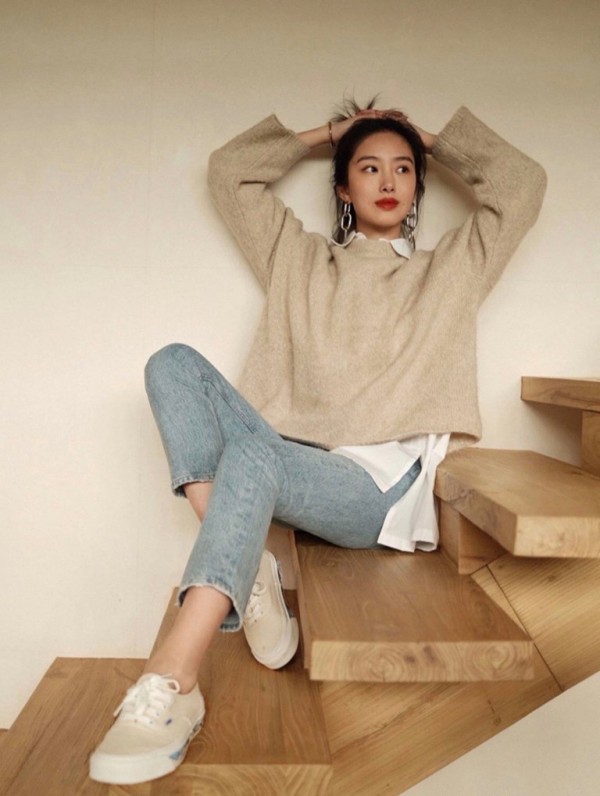 相比于前面几位女明星的私服搭配,杨采钰的穿搭则更显端庄与优雅。宽松的针织外套内搭白色衬衫,搭配上显得更有层次感,将衬衫衣角随意地垂在外面显得慵懒而又随性。雾霾蓝色紧身牛仔裤不仅能勾勒出杨采钰的腿部曲线,露脚踝的设计在视觉上更有显腿长的效果。