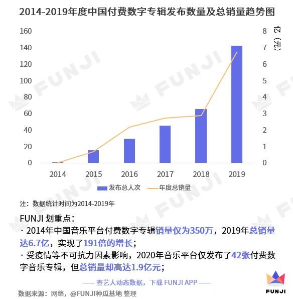 今年受疫情影响,截止目前只有42人次歌手发布了付费数字专辑,但也有1.9亿元的销售额。
